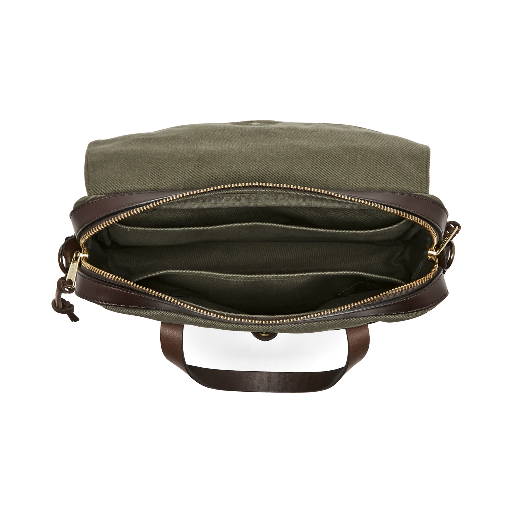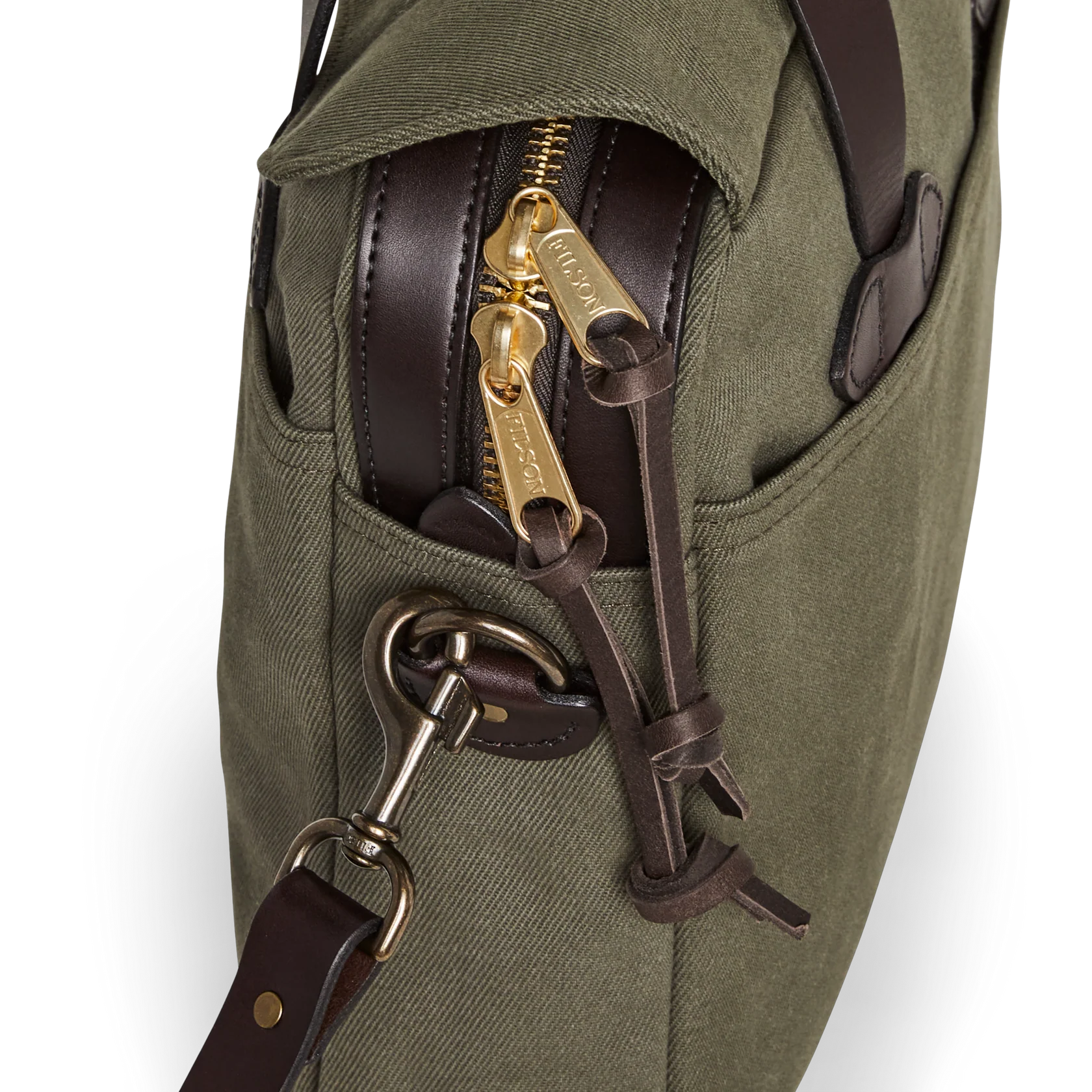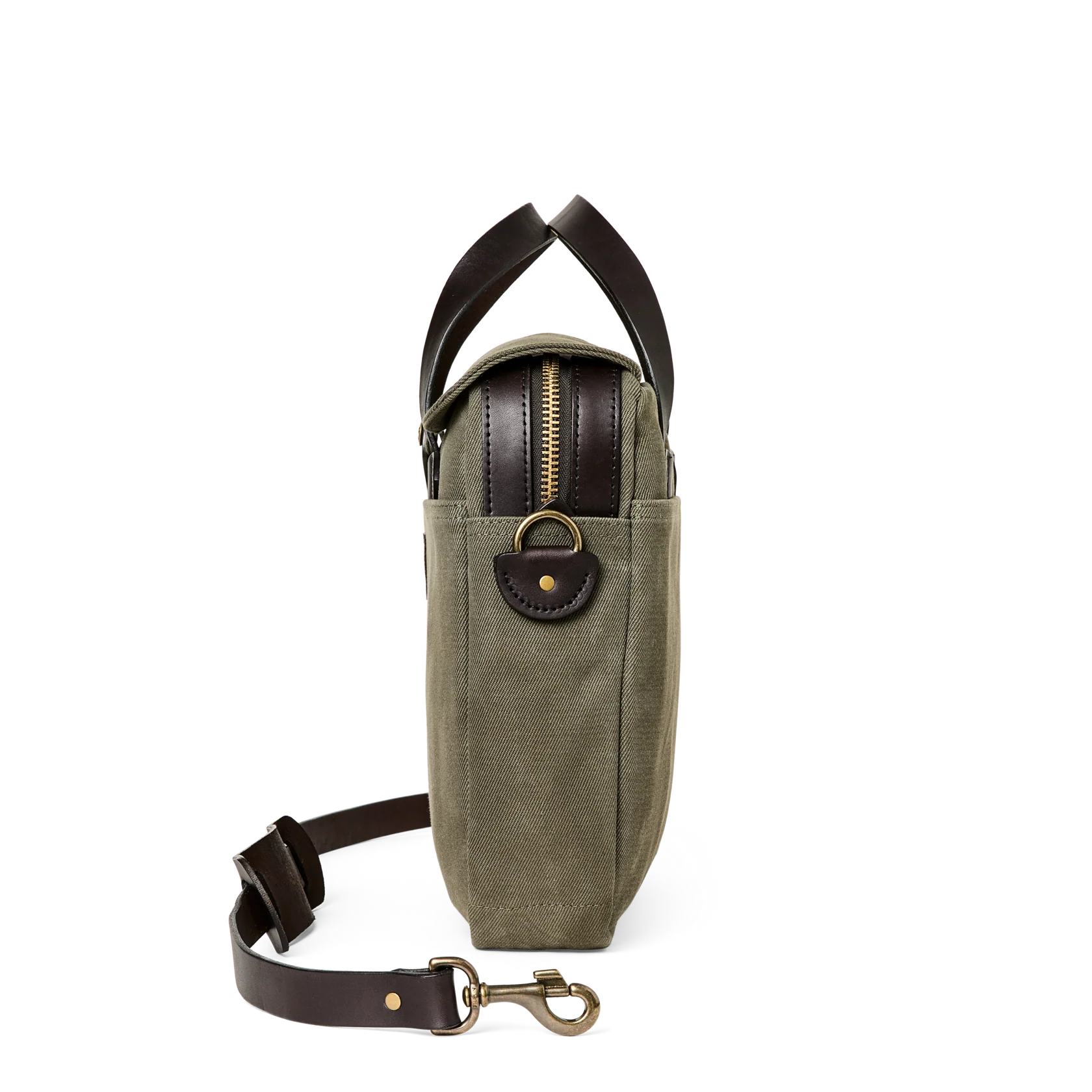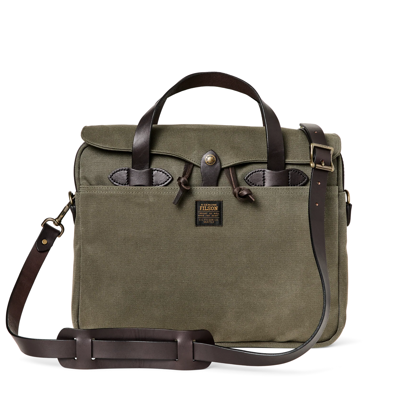 Made with our iconic Rugged Twill and Bridle Leather, the Filson Original Briefcase is built to survive any workplace, whether on land, at sea, or in the air. The lightly waxed fabric sheds water and withstands abrasion, year after year. The handles and detachable, adjustable shoulder strap are built with the same Bridle Leather that's used for making horse tack. The roomy interior has organizational dividers and space for a 15" laptop and secures with a YKK solid brass zipper protected by a storm flap. A testament to our signature fabric's durability, one customer recorded over one million miles of travel with his Original Briefcase.