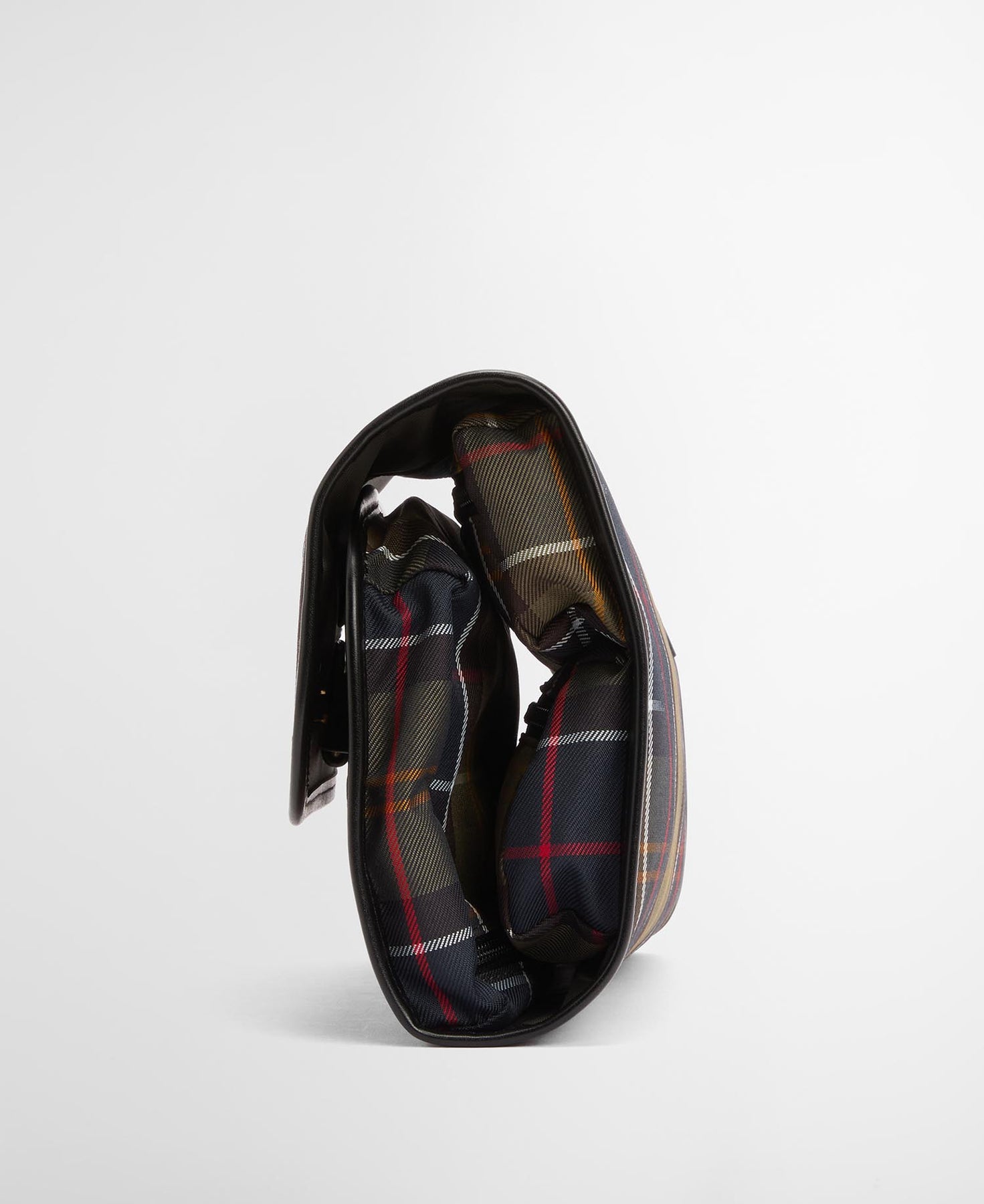 The Barbour tartan hanging washbag features a faux leather trim for a touch of sophistication. A concealed stud fastening under the front flap folds out to reveal multiple inner pockets for handy storage while you're on your travels. Boasting a hanging hook for functionality, the wash bag is finished with a discreet Barbour embossed badge to the front flap.